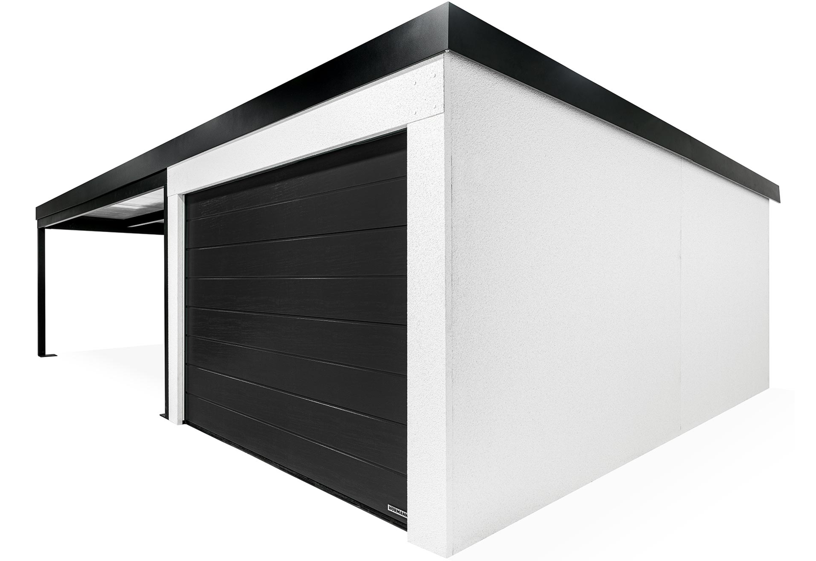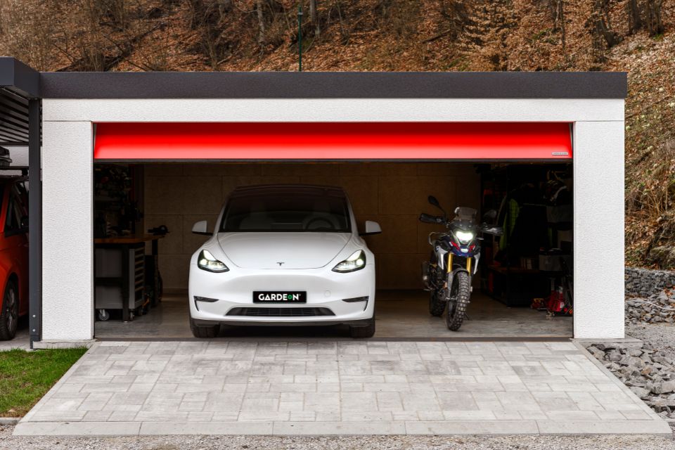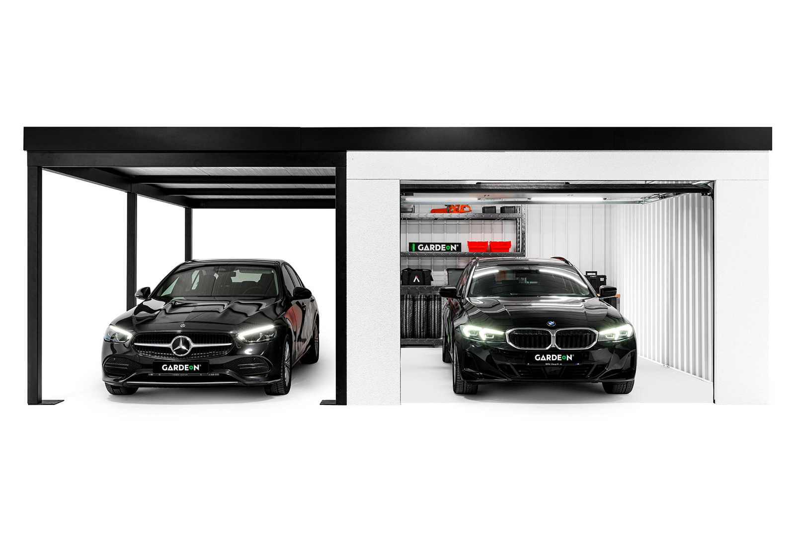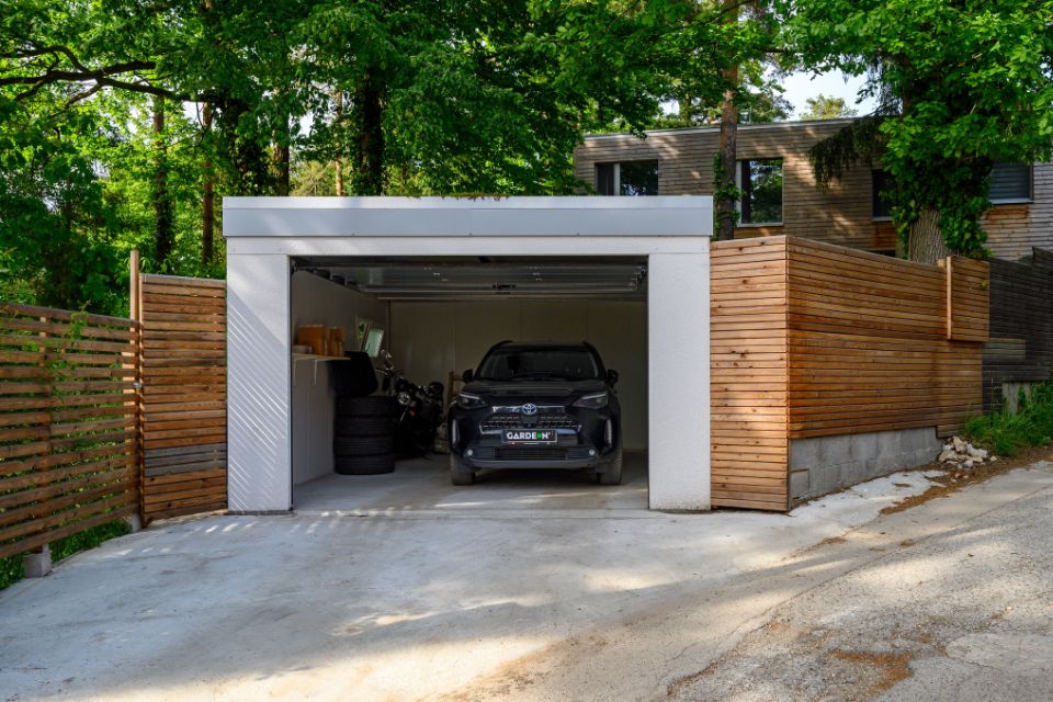 Discover an innovation in the construction industry - GARDEON® prefabricated garages with ready-made designer plaster from the Swiss brand KABE. The all-season facade is self-cleaning and can withstand water, high temperatures and all the vagaries of the weather with ease. Thanks to our unique technology, the steel wall is only 5 cm thick - much thinner than a 20 cm thick conventional brick wall. You will save significantly on space in your garden and inside your garage.