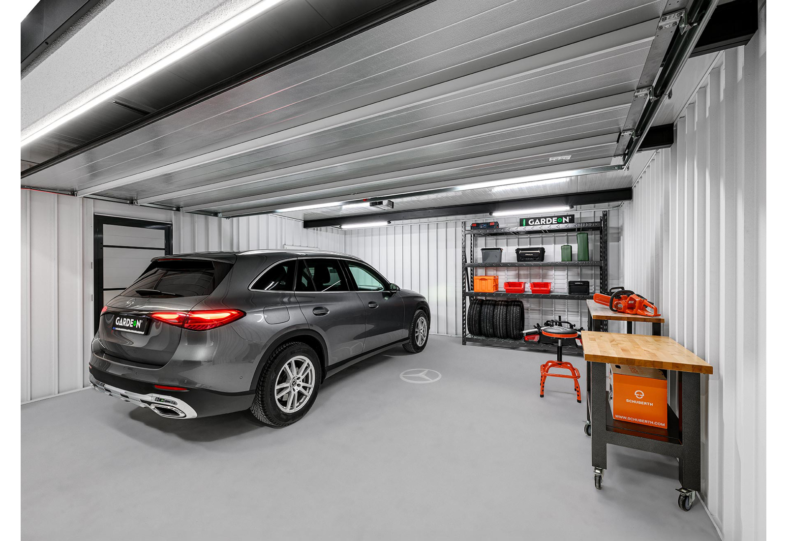 Discover an innovation in the construction industry - GARDEON® prefabricated garages with ready-made designer plaster from the Swiss brand KABE. The all-season facade is self-cleaning and can withstand water, high temperatures and all the vagaries of the weather with ease. Thanks to our unique technology, the steel wall is only 5 cm thick - much thinner than a 20 cm thick conventional brick wall. You will save significantly on space in your garden and inside your garage.