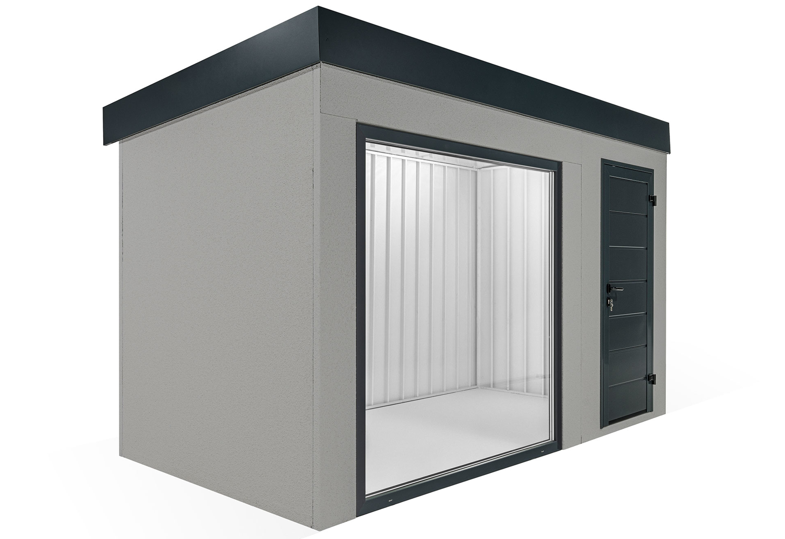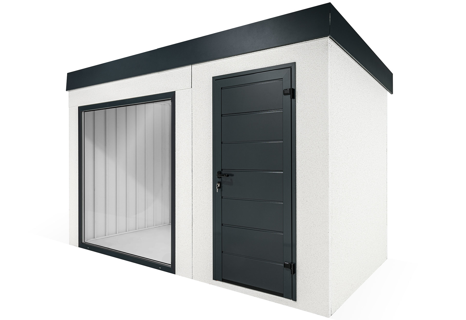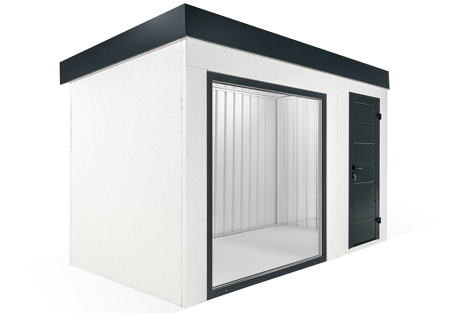 Discover an innovation in the construction industry - GARDEON® prefabricated garden houses with ready-made designer plaster from the Swiss brand KABE. The all-season facade is self-cleaning and can withstand water, high temperatures and all the vagaries of the weather with ease. Thanks to our unique technology, the steel wall is only 5 cm thick and, compared to a 20 cm thick conventional brick wall, you will save significantly on space in your garden and inside your garden house.