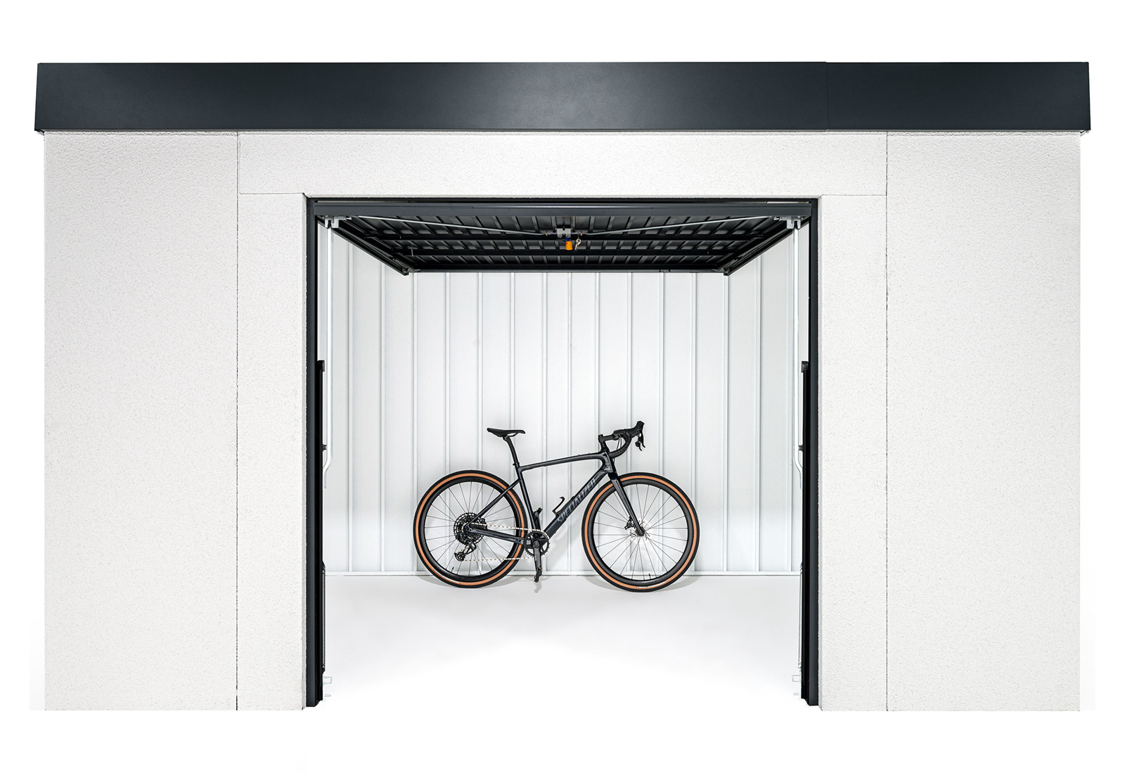The spacious garden shed with top-of-the-range Hörmann garage doors has built-in lighting and can be powered by solar panels. The security door cleverly closes to the ceiling and saves space. The ultra-quiet opening and closing of the door is a great bonus.