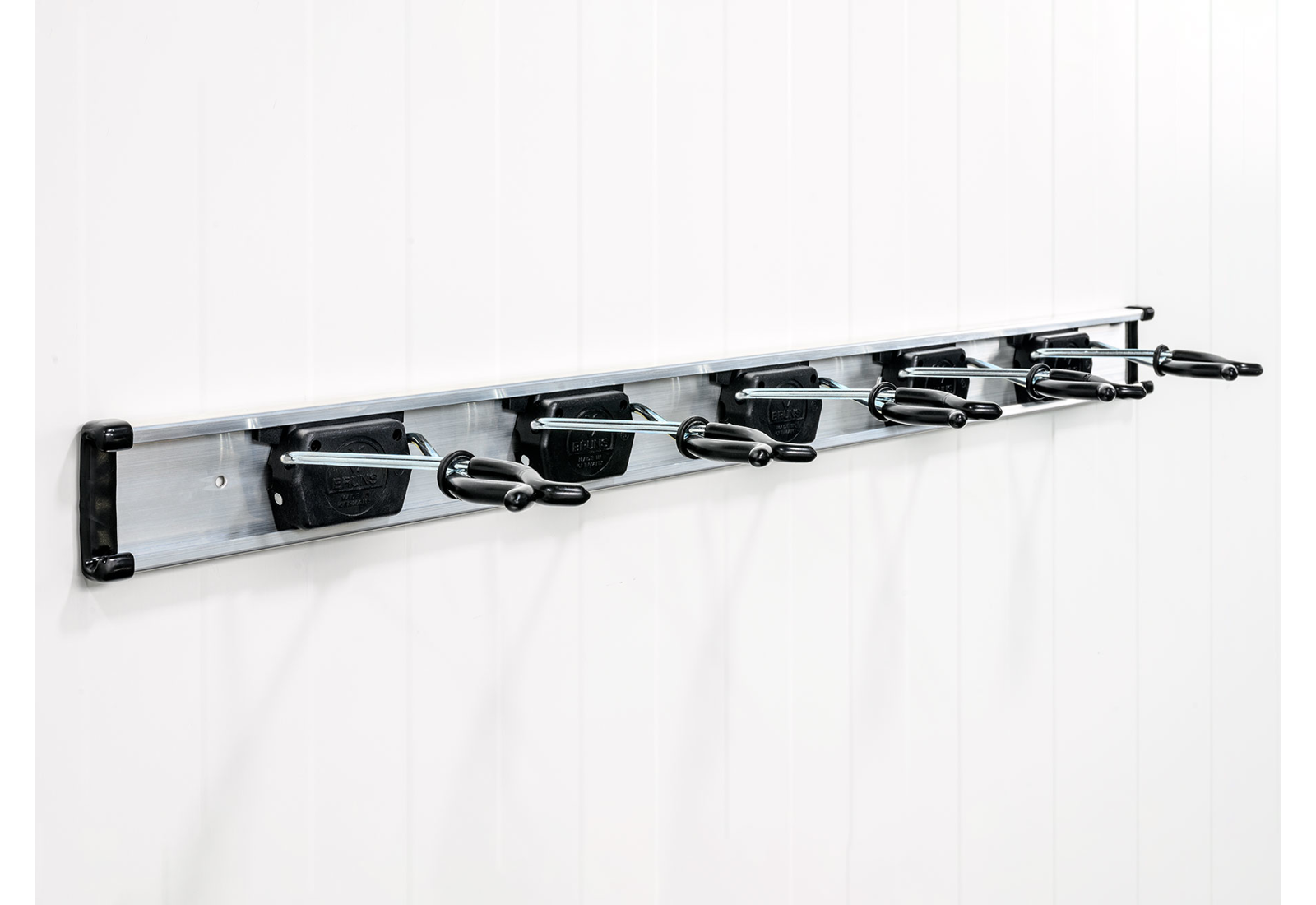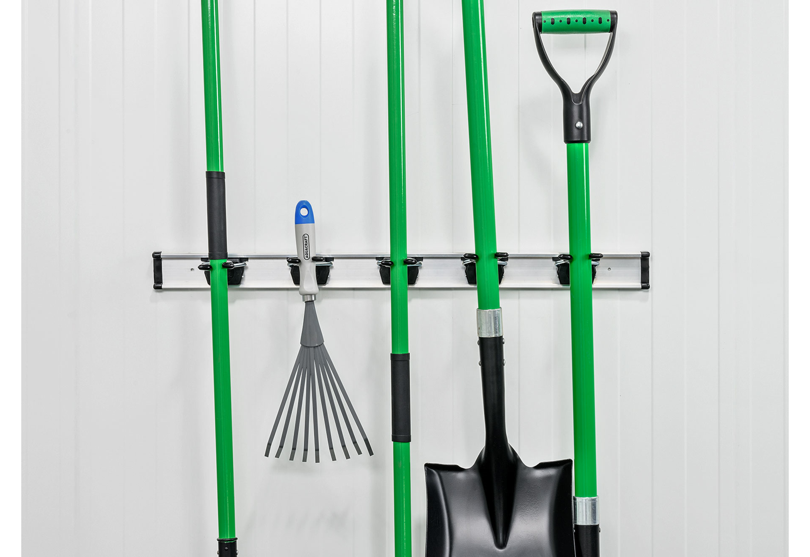 Our tool suspension system features a 0.75 m long support rail and five universal holders. It securely grips almost anything consisting of wood, steel, plastic and more with a diameter of 0 to 50 mm. So you can put everything you need in order - from rakes and spades to saws or axes. Regardless of what you store, it will be neatly arranged and easily accessible.